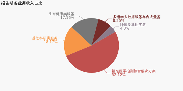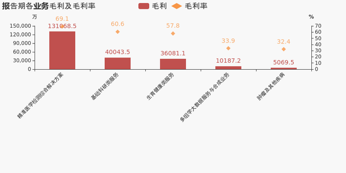 从其最新财报可以看到,精准医学监测综合解决方案是其营收主要来源,2021上半年营收19亿,占比为52.1%,毛利率为69.1%。生育健康类服务第三,占比17.16%。
