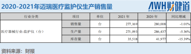 在ICU病房中最常见的监护仪产品上,迈瑞医疗2021年的产量,从2020年的280008台降至277169台,同比降低了5.36%,库存量更是同比下滑15.39%。
