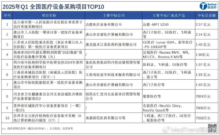 从采购项目来看,第一季度医疗设备采购规模前十金额超亿元的项目占七成。