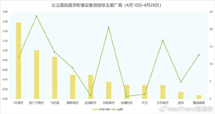 综合分析4月10日至26日的数据,GE医疗、西门子医疗和飞利浦在中标次数上占据领先地位,而在中标金额方面,西门子医疗、东软医疗和万东医疗表现更为突出。