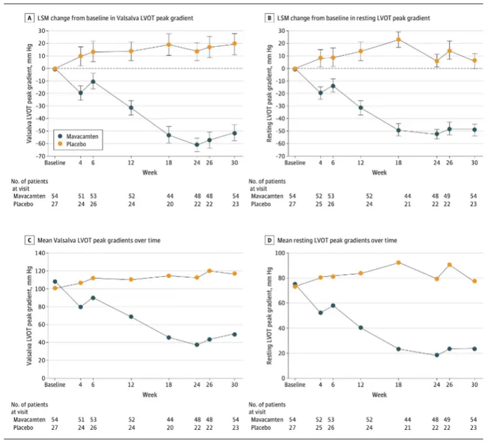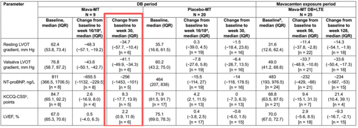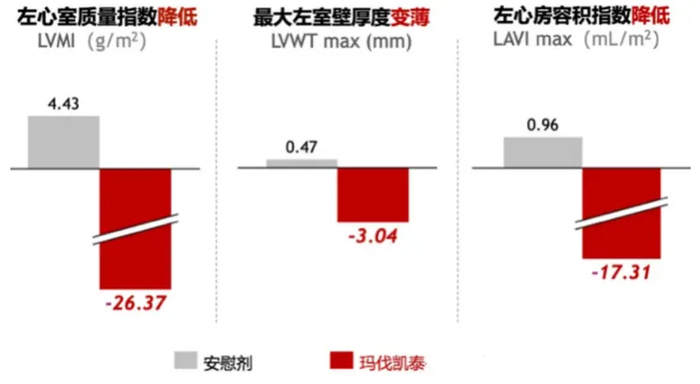 北京协和医院张抒扬教授团队在对EXPLORER-CN研究中58例有心脏磁共振(CMR)合格影像数据的患者进行分析后发现,与安慰剂治疗组相比,玛伐凯泰治疗组从基线到第30周左心室质量指数降低,最大左心室壁厚度变薄,左心房容积指数降低[14]。