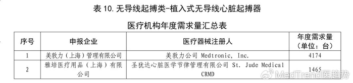 需求量第二:双腔起搏器(17301台)、无导线起搏器(1465台)、电极导线非左心室(44151根)均排名第二,总需求量占比25%+。