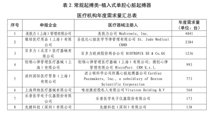 常规起搏类——医疗机构年度需求量汇总表