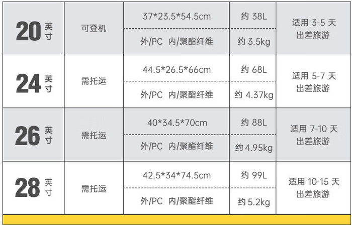 行李箱的尺寸一般在 16~ 32 寸,个人最推荐的尺寸是20寸,也就是我们常说的【登机箱】。大小适中,搭配上背包可以满足大部分的出行场景,而且无论飞机还是火车,登机箱大部分都可以作为随身行李带上飞机,坐火车的时候也可以放在座位上的行李区,可以因为托运,或单独放置带来的等待时间或安全问题。都非常的方便。