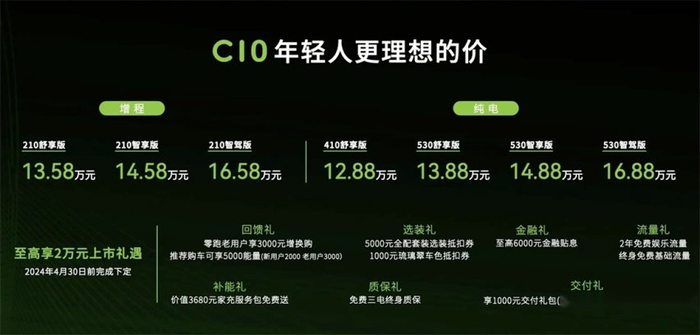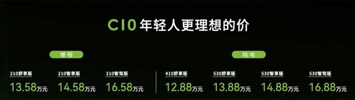 在全家桶焕新发布会上,零跑汽车不仅推出了全新焕新的C11、C01和T03三款车型,更带来了备受瞩目的“卷王”——零跑C10,零跑C10共推出7款车型,售价区间12.88万-16.88万元,纯电版本CLTC续航最高530km;增程版本CLTC纯电续航最高210km,CLTC综合续航最高1190km,上市期间还能享受至高2万元的七重上市礼遇。