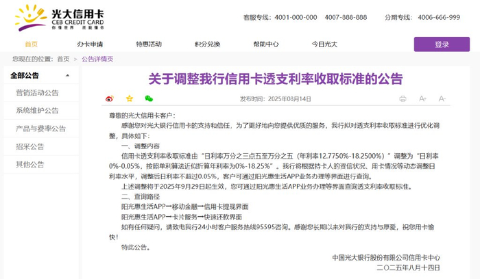 这一“拐点”的最新体现,便是透支利率的市场化改革。2025年9月29日起生效的光大银行一项规则,将信用卡利率拉向新下限,调整为“日利率0%-0.05%,按照单利算法近似折算年利率为0%-18.25%”。同时,其将根据持卡人的资信状况、用卡情况等动态调整日利率水平,调整后日利率不超过0.05%。