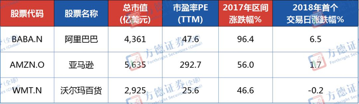 在过去的2017年,阿里巴巴表现远超美国的同行亚马逊、沃尔玛等,而昨天(1月2日)是2018年美股第一个交易日,阿里巴巴大涨6.51%,实现开门红。