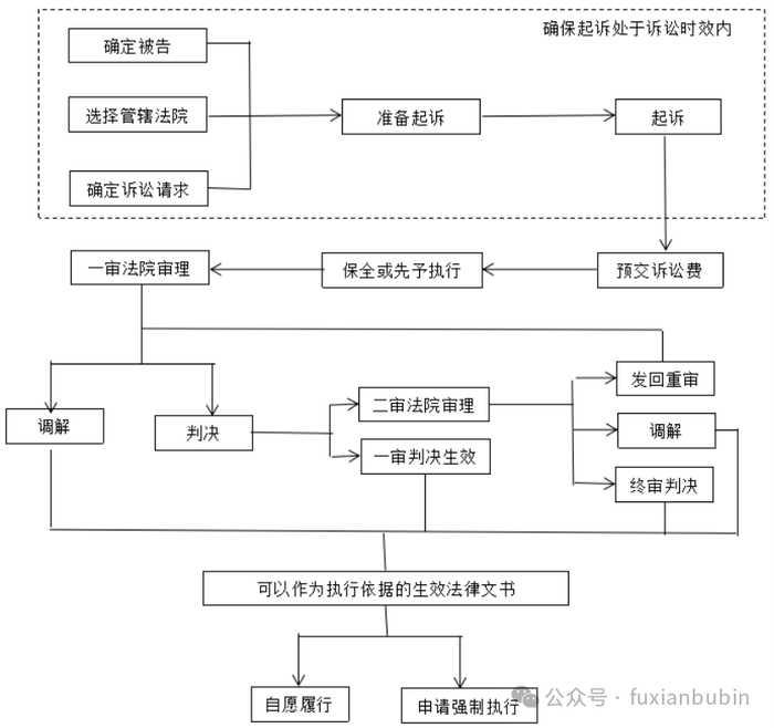 收购不良资产后,新债权人可以到法院起诉(诉讼费由败诉一方承担,但原告要先垫付)。法院判决胜诉后,可申请法院快速查封、冻结欠债人的资产,以便后续追回债务。诉讼前先就是要提请法院查封或冻结对方资产,立案后,法院查封对方财产后,原告应充分准备材料,积极应诉。诉讼阶段,按我国《民事诉讼法》规定,一审一般是半年,二审是3个月,两审终审。尽管《民事诉讼法》规定一审最长不超过半年,但法院经常会由于各种原因超过时限。判决后就申请执行,在判决胜诉后的半年时间内申请执行都是有效的。如果超过法定期限不申请执行,就丧失了强制执行申请权。诉讼流程较为复杂,主要如下图所示: