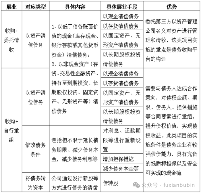 债务重组的组合方式是采用债务人以资产清偿债务、债务人将债务转为权益工具、修改其他条款三种方式中的一种以上方式的组合清偿债务的债务重组方式。在具体业务开展上,以股权+债权进行债务重组的操作模式: