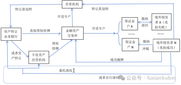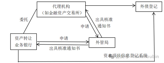外债登记后,不良资产出让银行将拟出让的不良资产进行打包,通过转让业务转让给金融资产管理公司或直接在金融资产交易所挂牌转让,境外投资者买断该不良资产包,在卖出以后,境内机构(如出让银行或不良资产经营主体)可以与境外投资者签订反委托请收协议,具体交易结构如下: