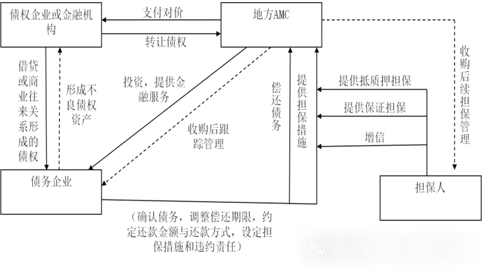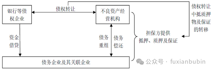 债务重组业务系以资产清偿债务,不良资产经营机构可以从银行等债权企业以债权转让的方式收购不良资产之后,启动债务重组业务,通过还款时间、金额、还款方式以及担保抵押等一系列的重组安排,实现未来债权的回收。具体交易结构如图所示: