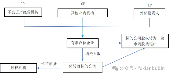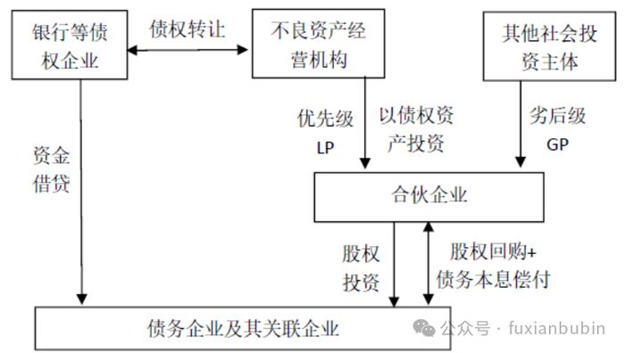 如果项目较为复杂,需要资金量较多,在这种情况下,可以考虑通过设立基金的方式(以合伙制私募基金为主)进行债务重组,根据“私募新规”规定,私募股权投资基金的股权和债权以不超过8:2的比例进行投资。具体交易结构如图: