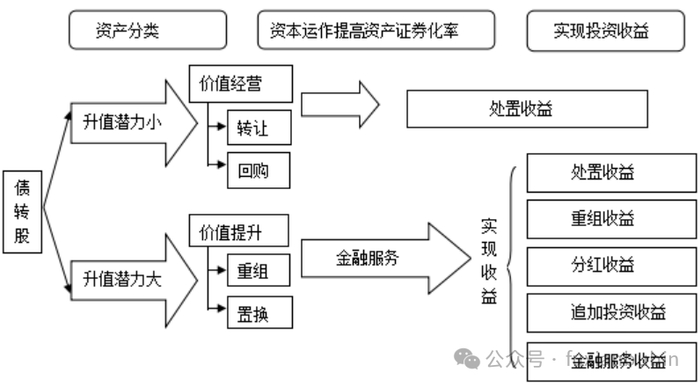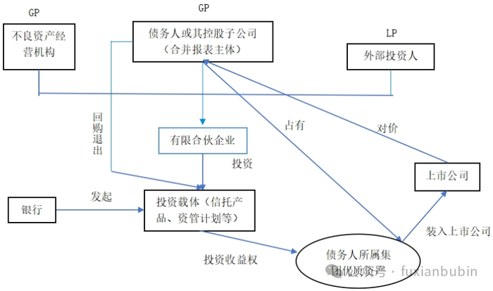 五是债转股投资载体模式。不良资产经营机构与债务人/债务人所属集团或其控股子公司合作设立有限合伙基金,担任双GP,外部投资人担任优先级LP,债务人或其控股子公司担任劣后级LP。基金通过投资载体(如信托计划)投资于债务人所属集团下属优质资产的受益权。基金存续期间,通过优质资产的收益获取期间收益。未来通过将该资产装入集团上市公司(如有)或由集团回购实现退出。