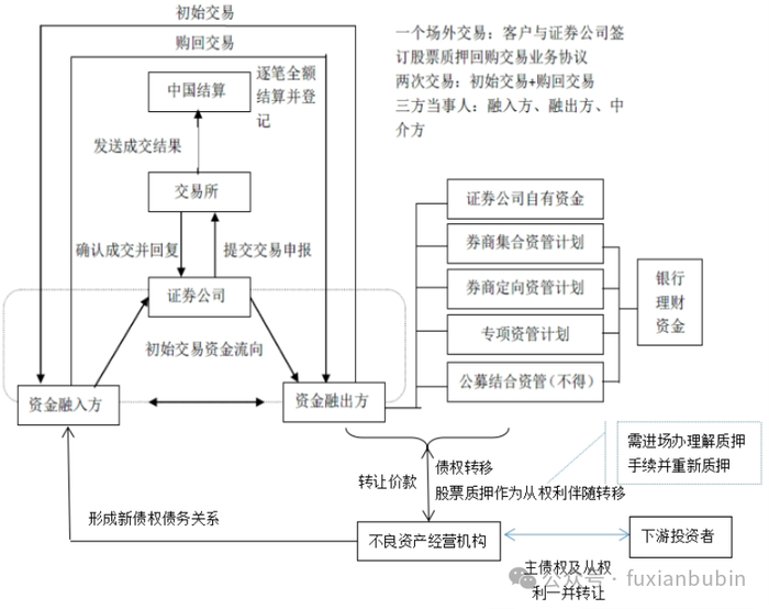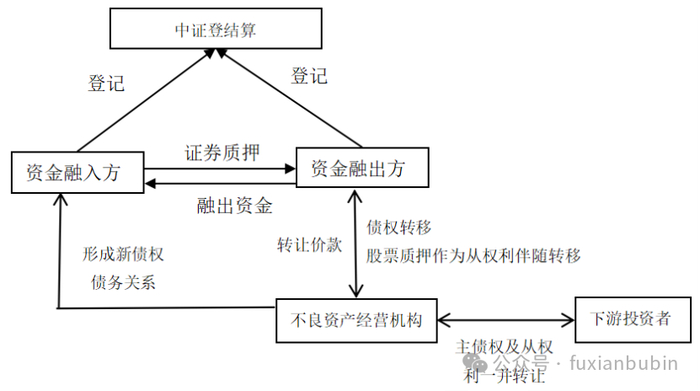 场外质押系指债务人或第三人以其持有的股票进行质押担保,为其向债权人的借款进行担保的交易行为。场外质押并没有标准化的业务模式,实践过程中开展此类型业务的模式多种多样。在不良资产收购转让业务中,依然是不良资产经营机构在从资金融出方手中收购债权过程中,将质押的股票作为从权利进行转移,在通过转让方式找到合适下游投资者的过程: