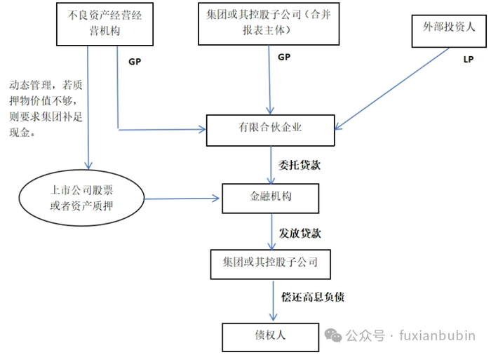 三是债转股并表基金模式。不良资产经营机构与债务人/债务人所属集团或其控股子公司合作设立有限合伙基金,担任双GP,然后由外部投资人担任优先级LP,集团或其控股子公司担任劣后级LP,然后基金通过金融机构委托贷款或直接放贷的方式,将资金提供给集团,用以置换存量高息负债,集团按期还本付息,并以其下属上市公司股票或其他资产作为质押(设置综合抵押率上限),不良资产经营机构对质押物进行动态管理,低于警戒线时要求集团使用现金方式补足(警戒金额设置为融资金额的一定比例)。