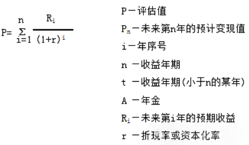 收益法是指通过估测被评估资产未来预期收益的现值,来估算资产价值。该方法采用资本或折现的途径及其方法来判断和估算资产价值。该评估思路是任何一个理智的投资者在购置或投资某一项资产时,所愿意支付或投资的货币数额不会高于所购置或投资的资产在未来能给其带来的回报。收益法利用投资回报和收益折现等技术,把评估对象的预期获利能力和获利风险作为两个相辅相成的关键指标来估测评估对象的价值,该方法用数学式可以表示为: