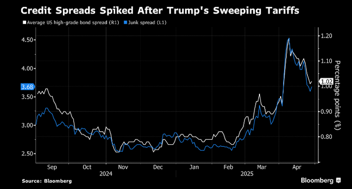 特朗普当选后,美国信用市场最初一片欣欣向荣。去年11月,美国优质公司债的风险溢价降至1998年以来最低水平。但好景不长,在特朗普全面推进关税计划后,债券市场遭遇自疫情以来最严重的一轮抛售。