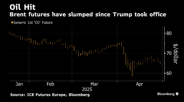 布伦特原油期货价格在4月初曾跌至每桶58.40美元,目前已回升至约65美元。