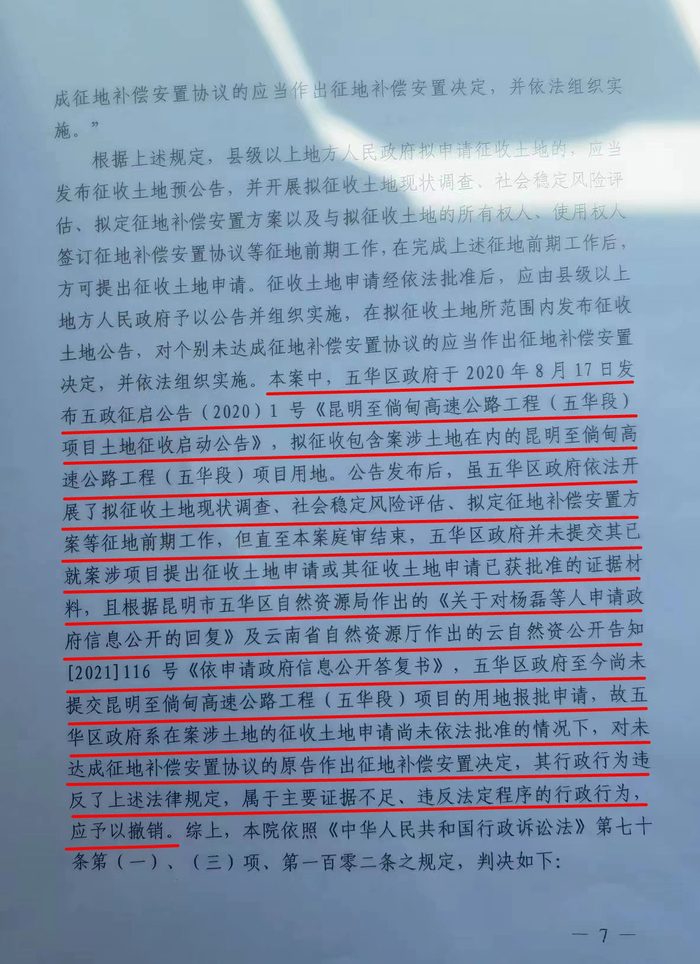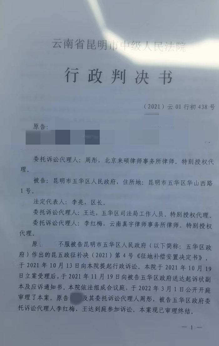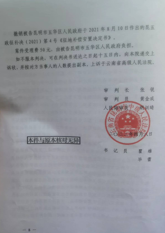 2022年4月8日,昆明市中级人民法院作出一审判决,撤销五华区人民政府作出的《征地补偿安置决定书》。