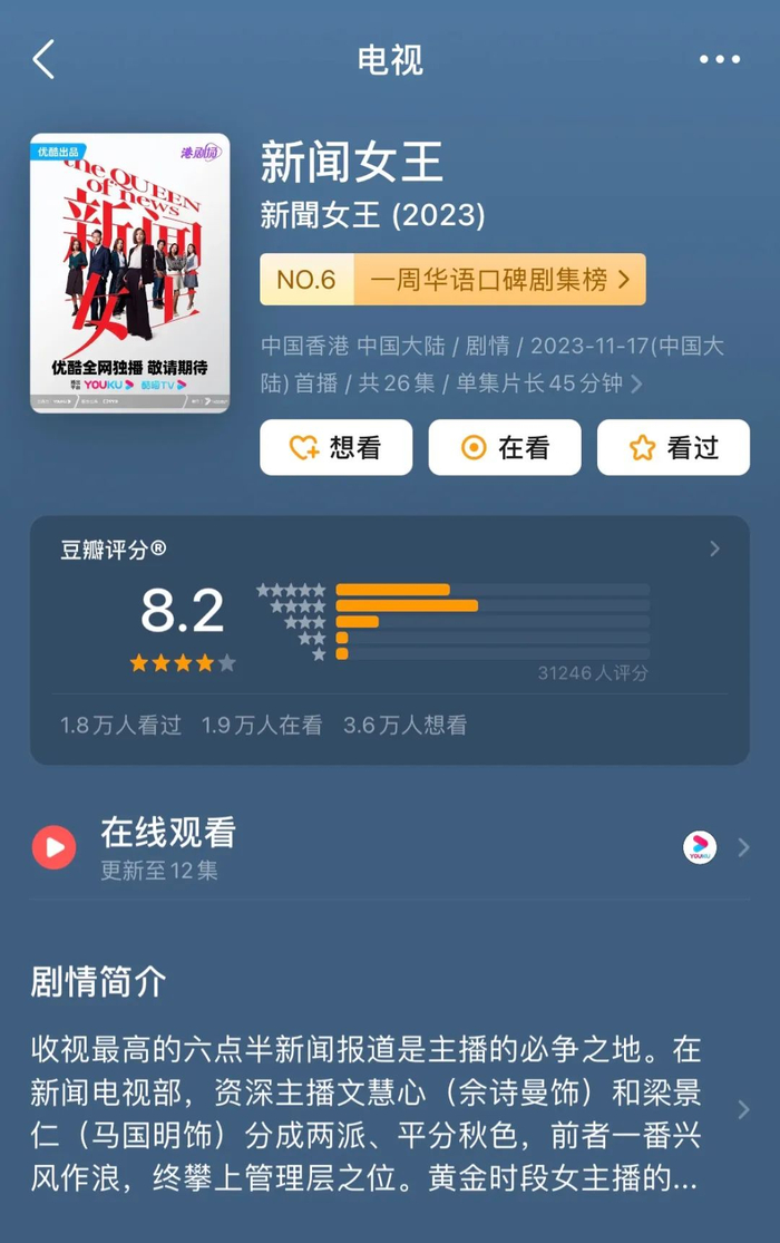 开播一周,优酷和TVB合力打造的职场剧《新闻女王》成了近日剧集市场的焦点,作为TVB的56周年台庆剧,《新闻女王》首播收视高达23点,网络上,豆瓣评分从7.9升至8.2,相关剧情点屡登各大平台话题榜,热度持续攀升高涨。