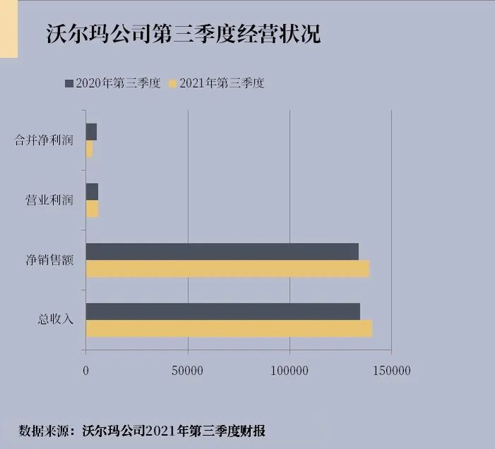 2021年第三季度,沃尔玛公司总收入与上一财政年度同期相比分别增长了58亿美元(4.3%)。但与此同时净利润也由于其在英国和日本的业务剥离,合并净利润分别与上一财政年度同期相比下降21亿美元,归属于沃尔玛的每股普通股摊薄净利润分别为1.11美元,与上一财政年度同期相比分别下降了0.69美元。这是沃尔玛的风险所在。