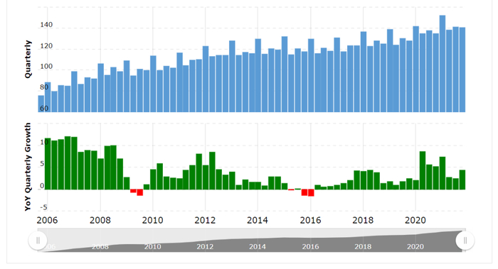 沃尔玛(WMT)一直是一只稳定和受欢迎的股票,仍然值得给予看涨评级。在2022年的大部分时间里,股价可能会徘徊在140美元的区间内,因为对消费者支出的情绪有所减弱。沃尔玛提供了22财年全年每股收益5.00美元的指导,在22财年第三季度发布时未调整。沃尔玛在撰写本文时的市盈率略高于50。根据以下消息来源,沃尔玛的5年平均市盈率为30.66。