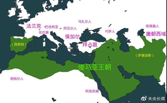 倭马亚王朝建立起统治后,继续开始了对外的扩展,他们向西征服了整个北非,设置还渡过直布罗陀海峡,登陆欧洲,征服了伊比利亚半岛,包括现在的西班牙和葡萄牙当时都是阿拉伯帝国领土,他们还曾试图继续向欧洲内陆扩展,但是遭遇了法兰克王国的阻击,最后领土仅仅维持伊比利亚半岛。