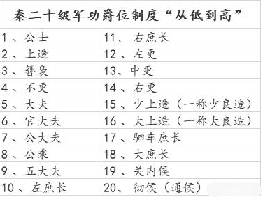 秦国的军功爵制度延续到统一的秦朝以后,并为以后汉朝所继承和发展。直到曹操在建安二十年(215年)爵制改革时所建立的六等新爵位制度,彻底代替了二十级军功制。“置名号侯爵十八级,关中侯爵十七级,皆金印紫绶,又置关内外侯爵十六级,铜印龟纽墨绶。五大夫十五级,铜印环钮,亦墨绶,皆不食租,与旧列侯关内侯凡六等。”从此盛极一时的军功爵制,彻底退出了历史舞台。