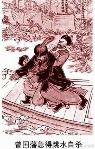 曾国藩在船上亲眼目睹湘军兵败如山倒的惨状,耳听河岸边“活捉曾剃头”的呐喊,心中想着此次败绩是自己有生以来遭遇的奇耻大辱,觉得万念俱灰,便步出船舱,两眼一闭,逃入水流湍急的湘江......就在他即将溺死之际,能文能武的幕僚章寿麟从船舱中跳了出来,眼疾手快将即将没顶的曾国藩拽住并拖上船来。曾国藩这才逃过一劫。