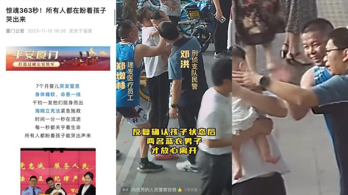 有一定医疗救助知识的他与民警邓洪密切配合,持续使用海姆立克法对婴儿开展施救。经历惊心动魄的363秒,婴儿终于吐出了喉咙的异物并哭出了声,转危为安的孩子也随即被120送往医院做进一步检查。