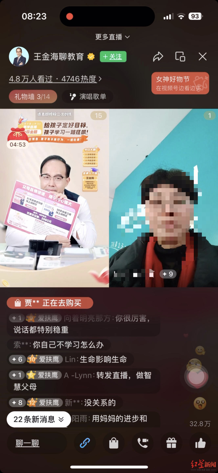 为了了解扶鹰为何有如此大的“魅力”,胡先生也曾进入王金海的直播间,他发现,直播间有上万人,王金海在直播间里推销着几千块的课程,让学员在朋友圈发布有关家庭教育的内容。胡先生在直播间评论中斥责、在视频账号下“曝光”,最后都被踢出直播间或被“拉黑”。