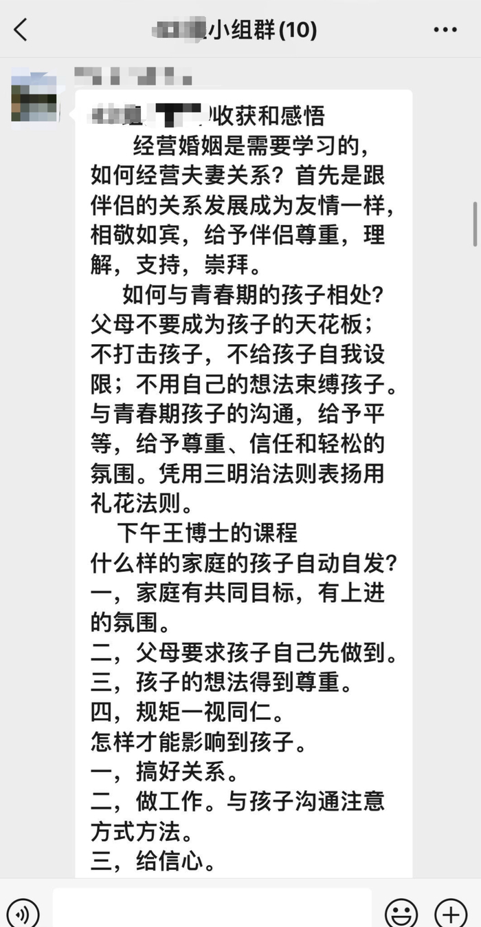 另一位连麦的母亲表示,她上了4期实践班、两期说话指导班、1期共情班、4期研修班,“线上和线下的学习,星期一到星期天每天都排满了。”她感觉自己每天都很阳光、积极向上,“不学习就感觉不自在,感觉很累。”