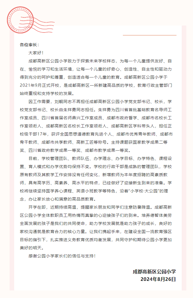 在这封给家长的信中,学校表示,因工作需要,刘靓同志不再担任成都高新区公园小学党支部书记、校长,学校党支部书记、校长由朱祥勇同志担任。