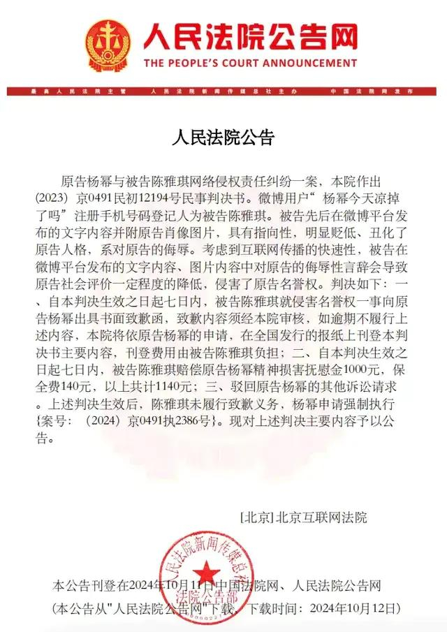10月11日,人民法院公告网刊登一则公告称,被告陈某某先后在微博平台发布的文字内容并附原告杨幂肖像照片,具有指向性、明显贬低、丑化了原告人格,系对原告的侮辱。法院判决被告陈某某公开道歉并赔偿杨幂精神损害抚慰金1000元,保全费140元,共计1140元。公告显示,陈某某未履行致歉义务,杨幂申请强制执行。