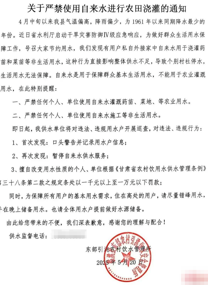 ▲网传通知红星新闻记者注意到,5月20日,东部引洮农村饮水管理所发布了《关于严禁使用自来水进行农田浇灌的通知》。通知称,4月中旬以来,该县气温偏高,降雨偏少,为1961年以来同期降水最少的年份。“近日省水利厅启动干旱灾害防御IV级应急响应,为做好群众生活用水保障工作,号召大家节约用水,我们发现有用户私自接家中自来水用于浇灌药苗和菜苗等非生活用水,这种行为直接影响整体供水不足,导致个别村社停水,生活用水无法保障。自来水是用于保障群众基本生活用水,不能用于农业灌溉用水。在此提别提醒:一、严禁任何个人、单位使用自来水灌溉药苗、菜地等农业用水;二、严禁任何个人、单位使用自来水施工等非生活用水。”