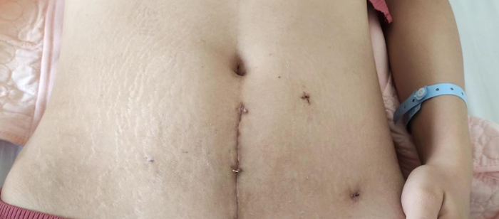 ▲白女士称,自己腹部留下一道长长的伤疤医院: