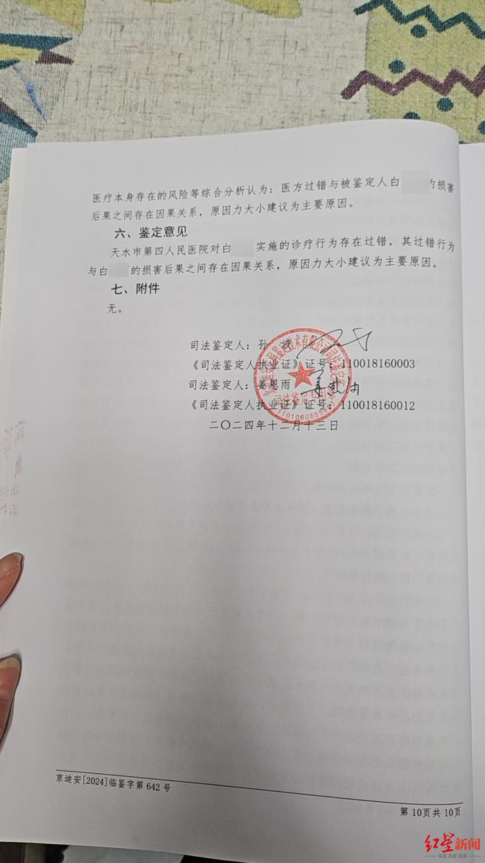 白女士提供的司法鉴定书显示,2024年12月13日,鉴定意见为天水市第四人民医院对白女士实施的诊疗行为存在过错,其过错行为与白女士的损害后果之间存在因果关系,原因力大小建议为主要原因。