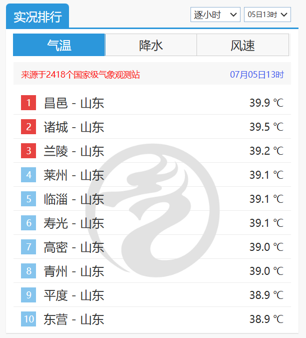 ▲5日中午1时的高温榜前十名被山东城市“霸榜” 图据中央气象台网站 红星新闻记者5日中午查询中央气象台网站看到,当天中午1点的实时气温榜单中,前十位均为山东城市,其中昌邑以39.9℃占据榜首,排名第十的东营为38.9℃,而淄博以39.1℃位列第五。