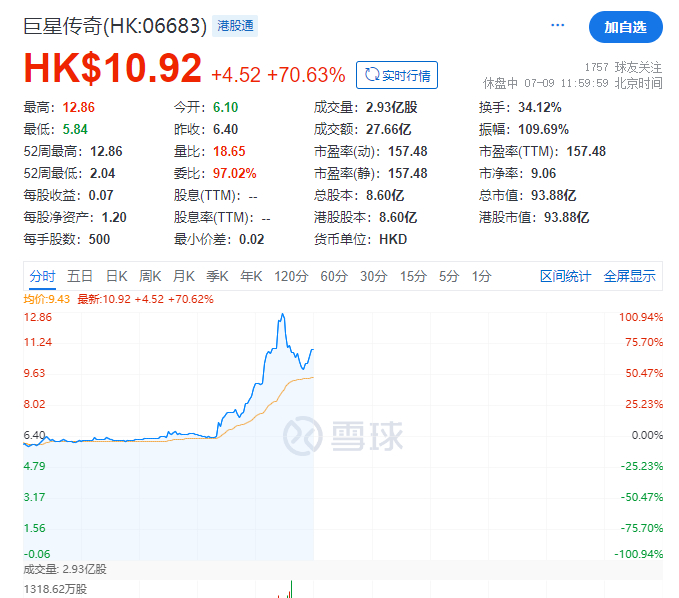 7月9日,受此消息影响,多只与周杰伦相关的概念股大涨。港股巨星传奇(06683.HK)盘中放量大涨100%,截至午间收盘该股涨70.63%,报10.92港元/股,总市值93.88亿港元。