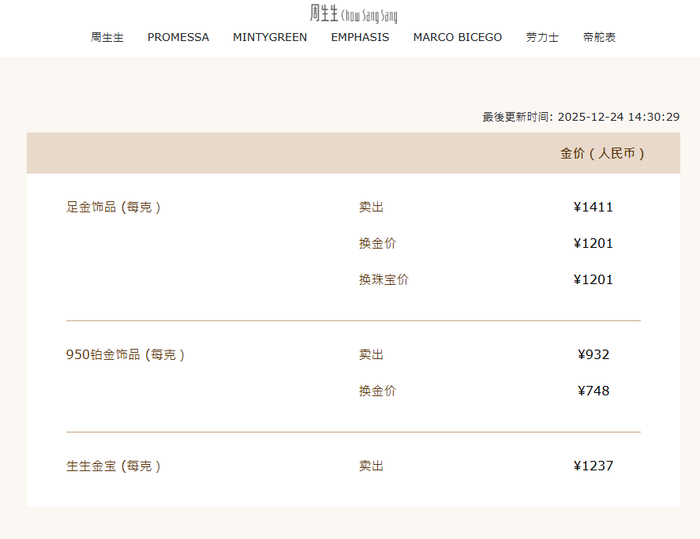 周生生官网今日金价截图薛洪言表示,国内品牌金店足金饰品价格持续上涨,其最直接、最主要的驱动因素是国际金价的飙升和国内基础金价的上行。金饰零售价格会即时反映原料成本的变动。除此之外,国内金饰价格还包含了较高的品牌溢价、工艺加工费以及各类渠道运营成本。