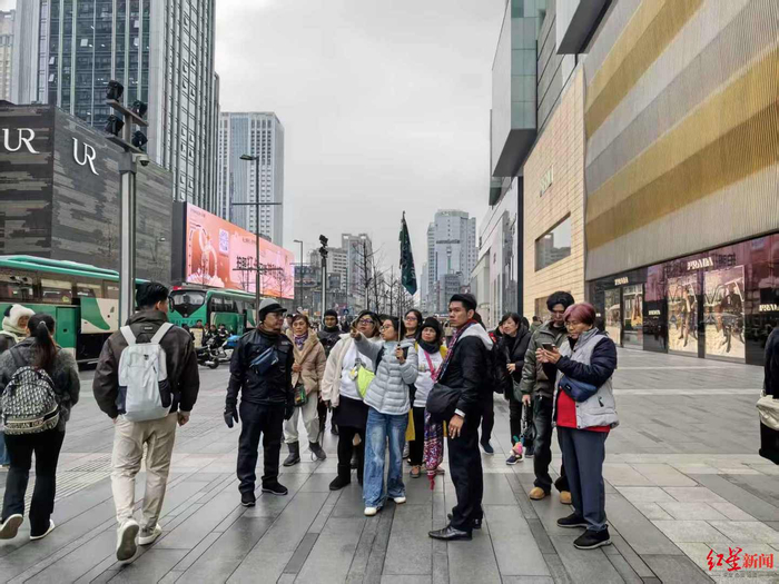 ▲导游维达正在带泰国游客逛春熙路商圈据统计,2025年,成都边检站共查验出入境外籍旅客172万余人次,同比增长52.3%。元旦前夕,很多外国游客已经提前抵达成都,准备在成都跨年。