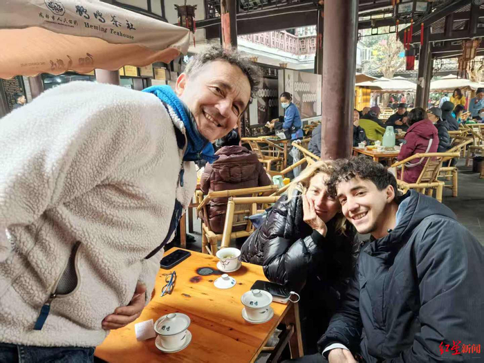 ▲来自意大利的毛罗·纳尔德利(Mauro Nardelli)一家人,在人民公园喝盖碗茶入境游便利化措施越来越完善