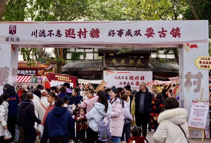 作为“村糖会”的重要一站,黄龙溪古镇在元旦当天便迎来1.8万游客,市井印象广场、璞院广场等地人头攒动,喜庆洋溢。本地商家集结,带来非遗文创、特色农产与旅游商品,满足游客“逛吃买”一站式需求。