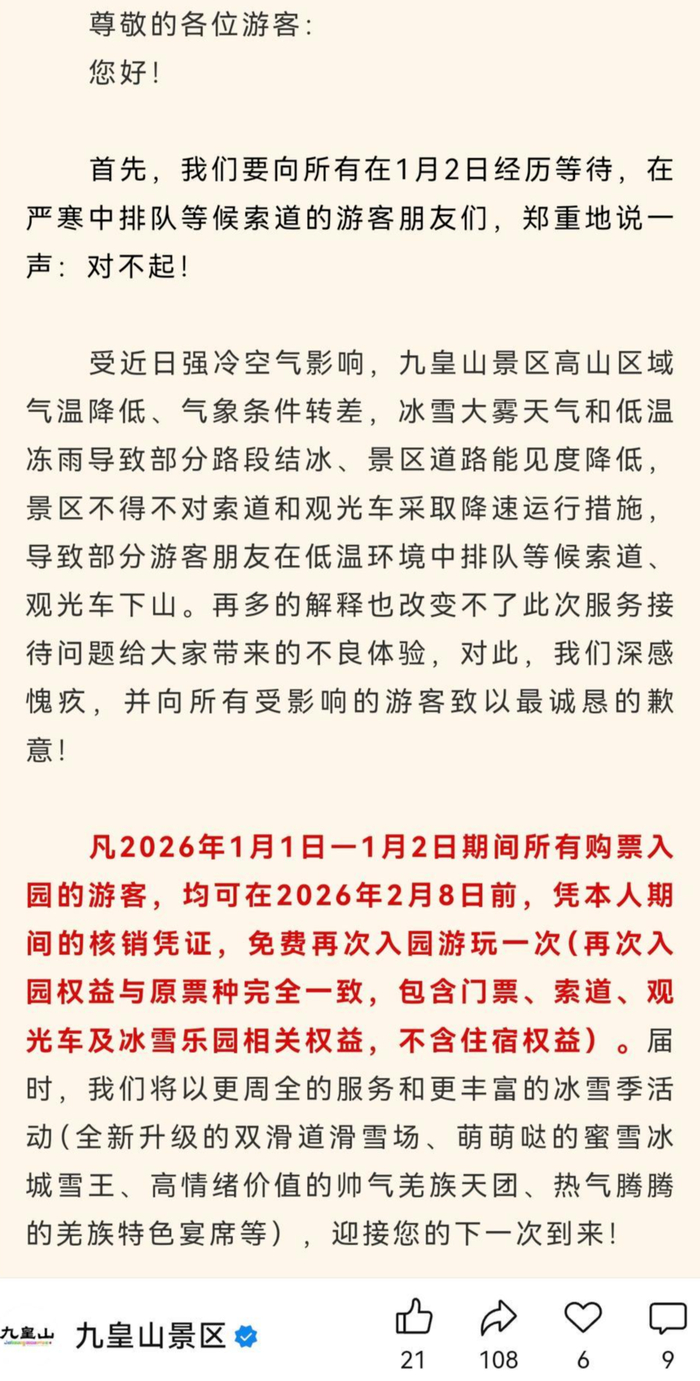 1月2日晚,有游客在社交平台发布视频,称山顶滞留大量游客。3日,九皇山景区发布了致游客的一封信,向所有受影响的游客致以最诚恳的歉意。同时,景区表示,凡在2026年1月1日—1月2日期间购票入园的游客,均可在2026年2月8日前,凭本人在此期间的核销凭证,免费再次入园游玩一次。