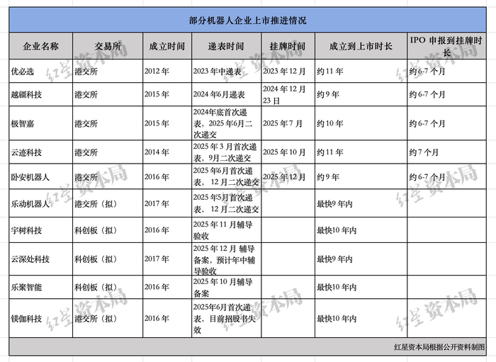 已上市的极智嘉、云迹科技、卧安机器人均经历了二次递交情况,首次递表至最终挂牌,一般耗时6至7个月。2025年递表的乐动机器人和镁伽科技,也来到了7个月的时间点,但还未有新进展。