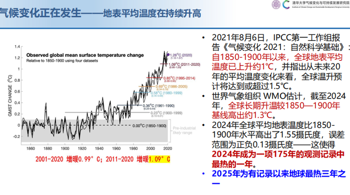 “2024年是有纪录以来最热的一年,2025年是有纪录以来最热的三年之一,形势很严峻。”李政介绍,《巴黎协定》提出的到本世纪末升温控制在1.5℃的目标,实际上在2024年已经突破了。这只是单年的突破,在长时间尺度上,这是一个征兆。IPCC第一工作组的研究报告《气候变化2021:自然科学基础》显示,自1850年—1900年以来,全球地表平均气温已上升约1℃。未来20年的平均气温变化来看,全球升温预计达到或超过1.5℃。