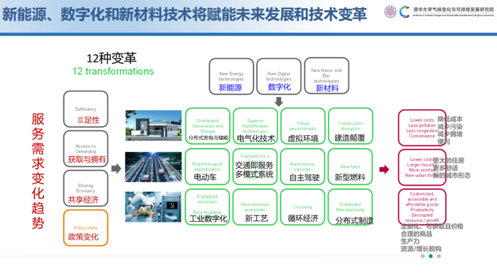 ▲数字技术带来的12种变革李政介绍,他的课题组和法国施耐德公司做了联合研究,数字技术要发挥作用,前提是要对经济社会有新的认识。新能源技术、新材料和制造技术、数字化技术,这三个基本技术将支撑未来经济社会的变化。未来经济社会因为“政策驱动”“共享经济”“获取和拥有的变化”“富足性”等变化产生了4种塑造未来的力量,“新能源”“数字化”“新材料”三种技术会创造出在工业、交通、建筑等方面的12种变革。