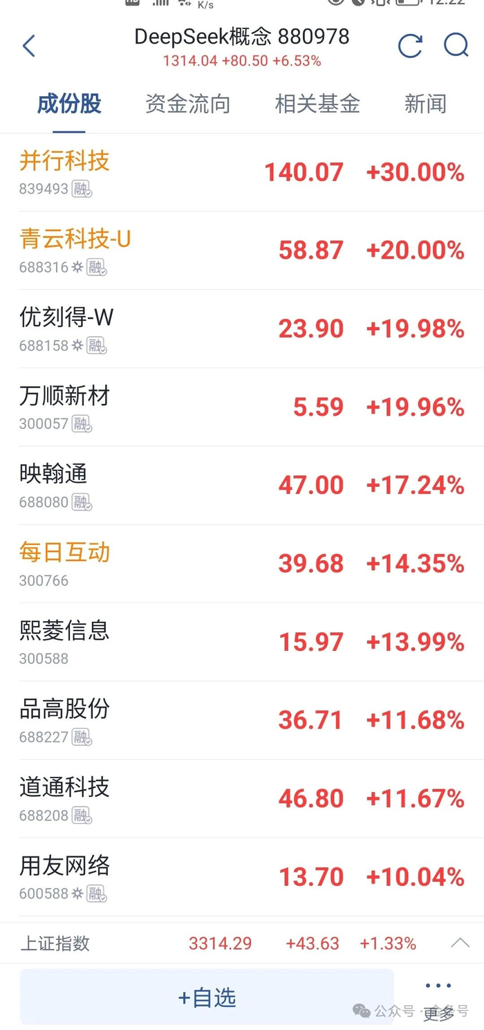 deepseek概念继续进攻,十多只涨停,而青云科技与优刻得20厘米涨停,连收三四个大板。而科技机器人部分冲高回落。
