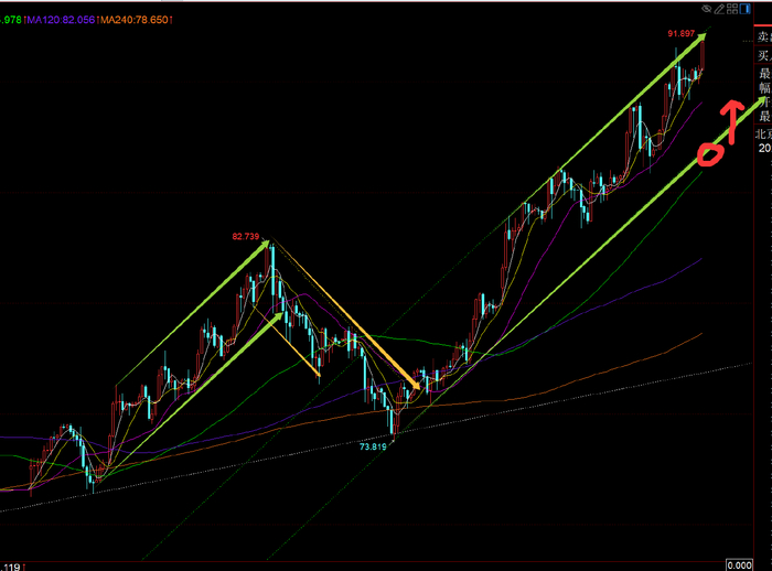 白银方面:从上图可以清晰看到,近期走势规律,目前运行坡度比较陡的上行通道,和前面一波是很雷同的,所以它的下轨支撑是节点,比较重要,当前上移87一线,只要守住下轨,则继续延续通道不断向上发展,而一旦失守下轨,则会走前面类似的黄色下行通道进行短期调整;当然,大趋势多头一直不变,涨多了,涨太猛太快,出现调整也是很正常,可以有机会再次逮相对波段北上位置;今晚阻力92.5下,临近上轨,谨慎追北,回踩下轨87的上方稳定继续北上;