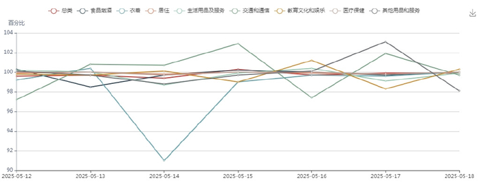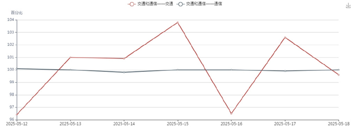 本周各大类日指数波动幅度较大。交通和通信在5月15日涨幅达2.9%,下设交通中类在5月15日涨幅最大达到3.8%。
